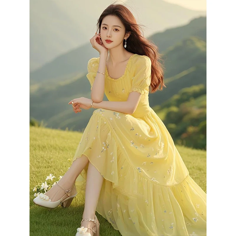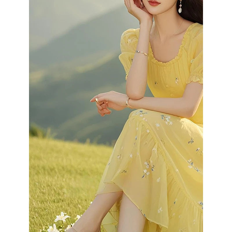 This yellow floral dress features a distinctive French-style design, making it a standout piece in any wardrobe.